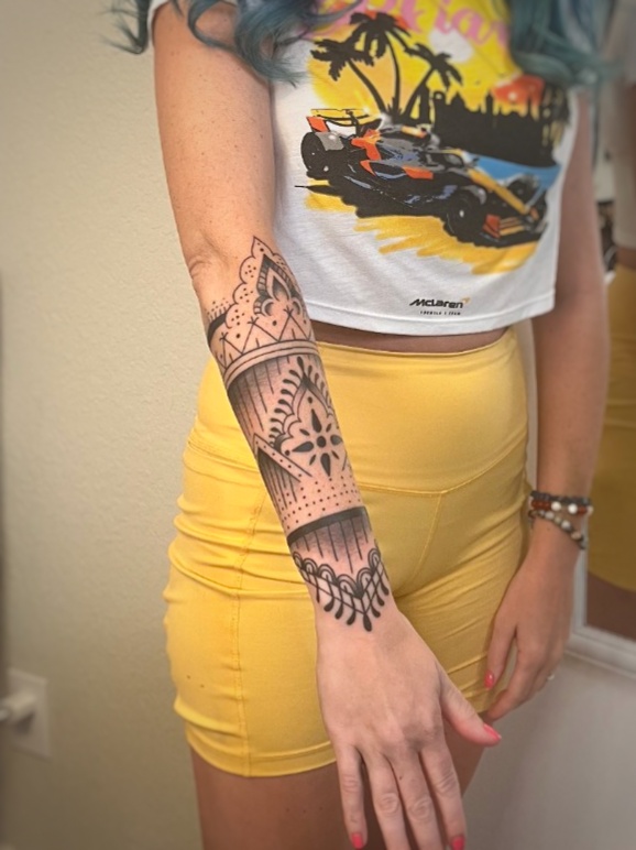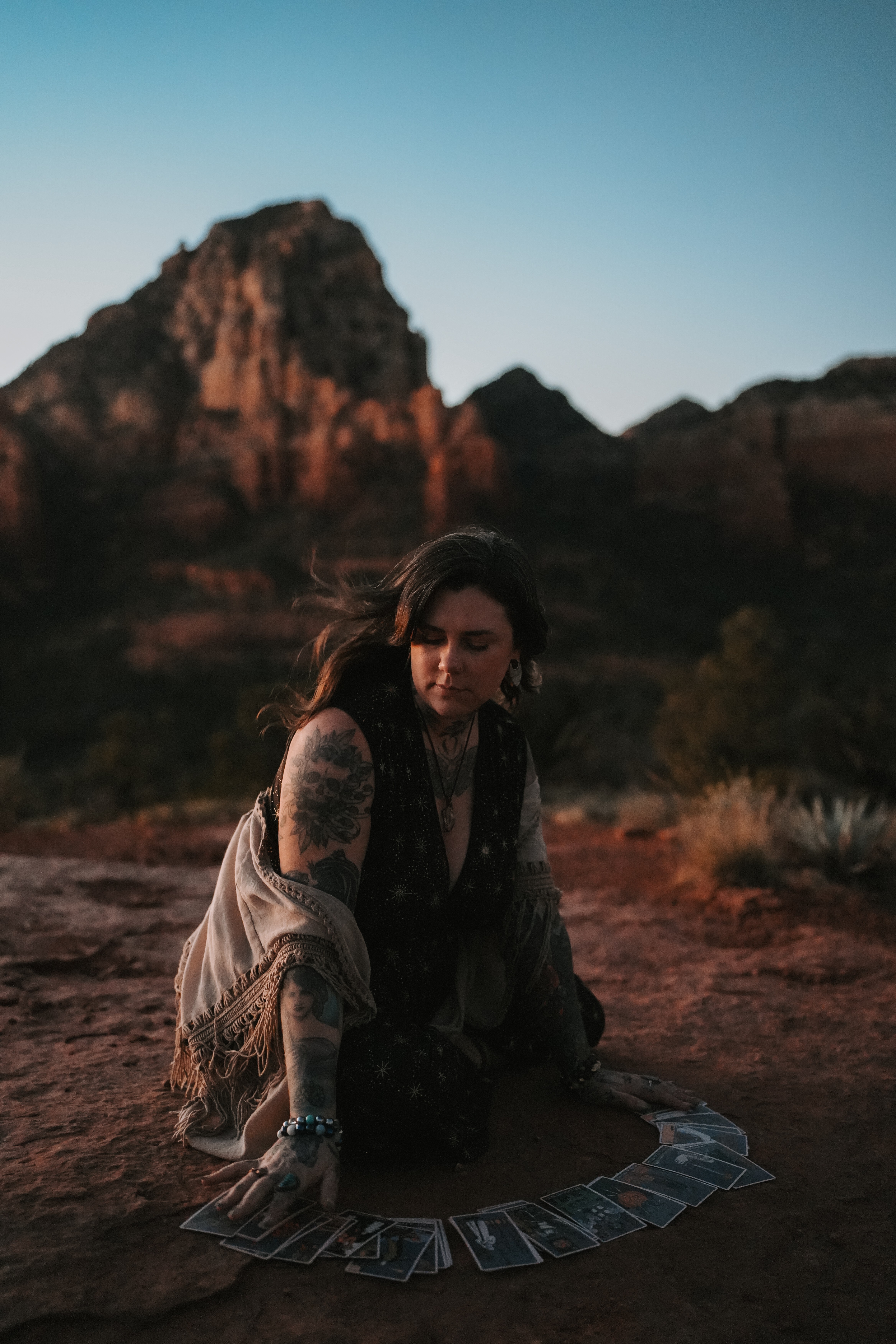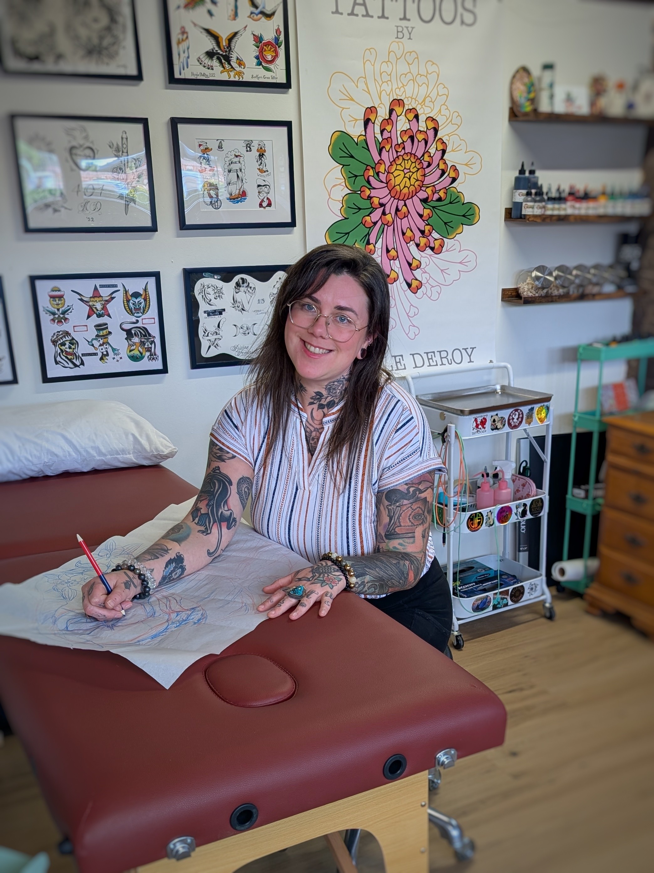 I’m Nicole DeRoy, the owner of Sacred Rebel Tattoo in Sedona Arizona. I’m a tattoo artist and energy worker, and my shop blends bold, color-forward illustrative traditional tattooing with Reiki, tarot, and intention-based ceremonial practices.