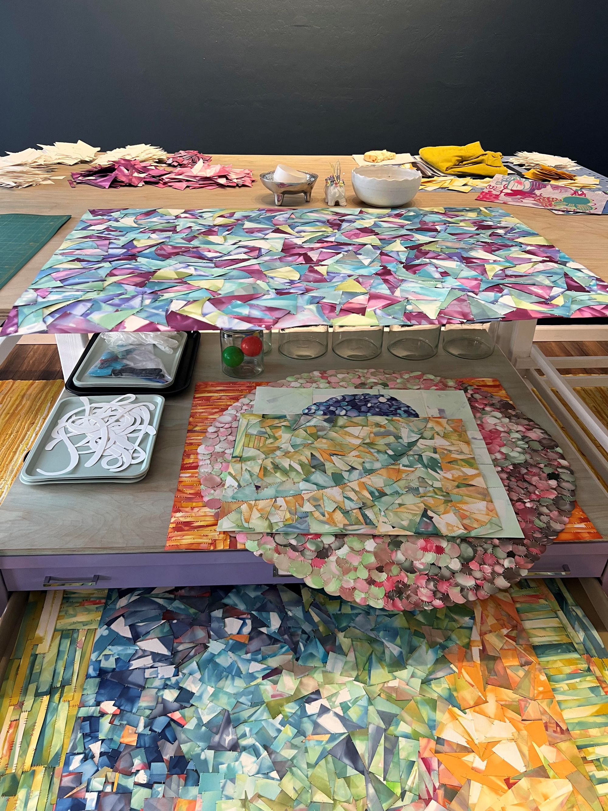 I have the same studio battle over and over. It’s the continual battle of thinking I can do everything I want in the studio. It mostly happens around this time of year, when I start reflecting on what I’ve done and what I haven’t, and set goals for the following year. My goals are always wildly unattainable! Then, in February, I recall doing this each year, and I hunker down, really focusing on the larger work in the studio, and I become ambitious in a different way. I don’t diversify my work as much (and dream about creating puzzles), and I return to the core of my art, which is cutting, dyeing, and stitching paper.