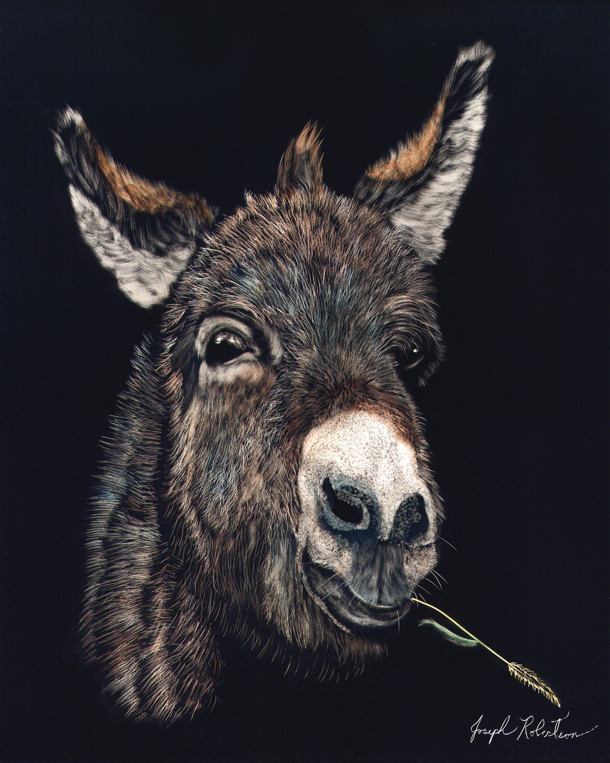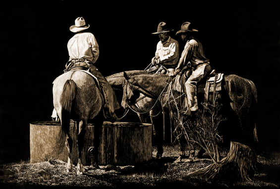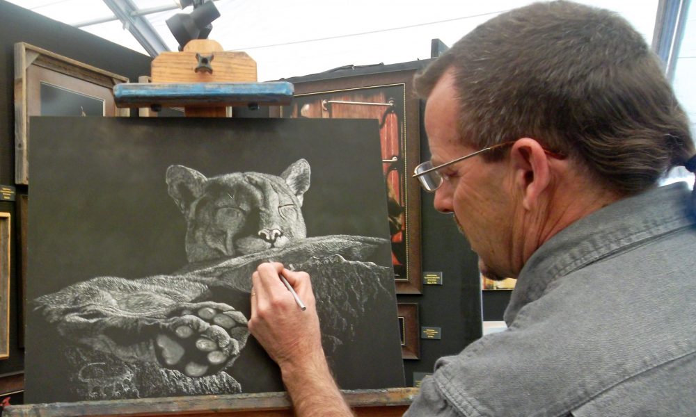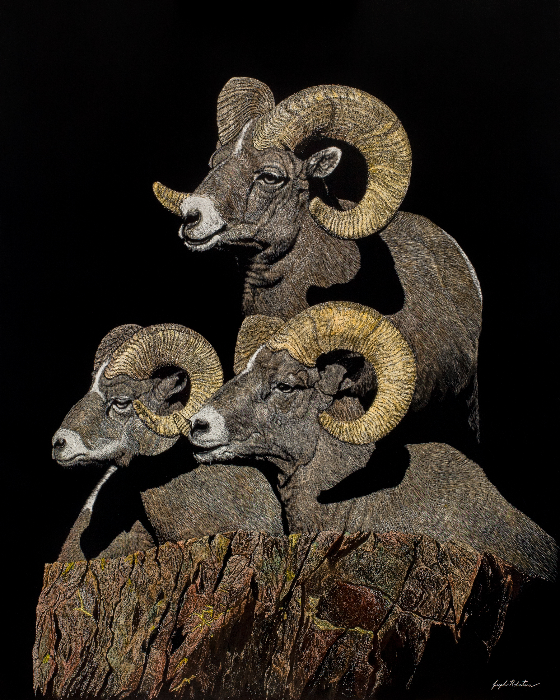 Joseph has spent his life in the arts. First as a musician and composer, now as a Western and Wildlife artist. Self-taught, he works in scratchboard (a whiteboard covered in black ink). His images are scratched or etched into the board then hand colored with transparent washes of acrylic paint. Subjects are often captured by the artist’s camera first then used as reference material for later works of art.