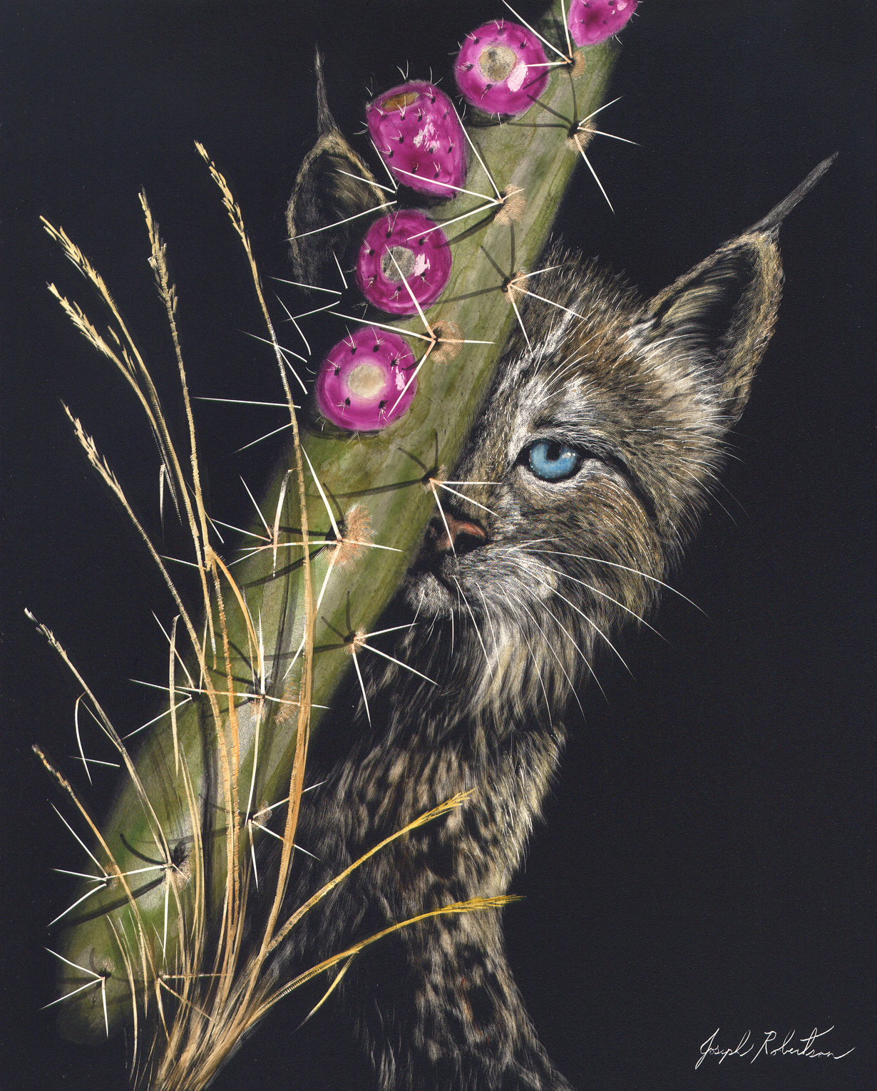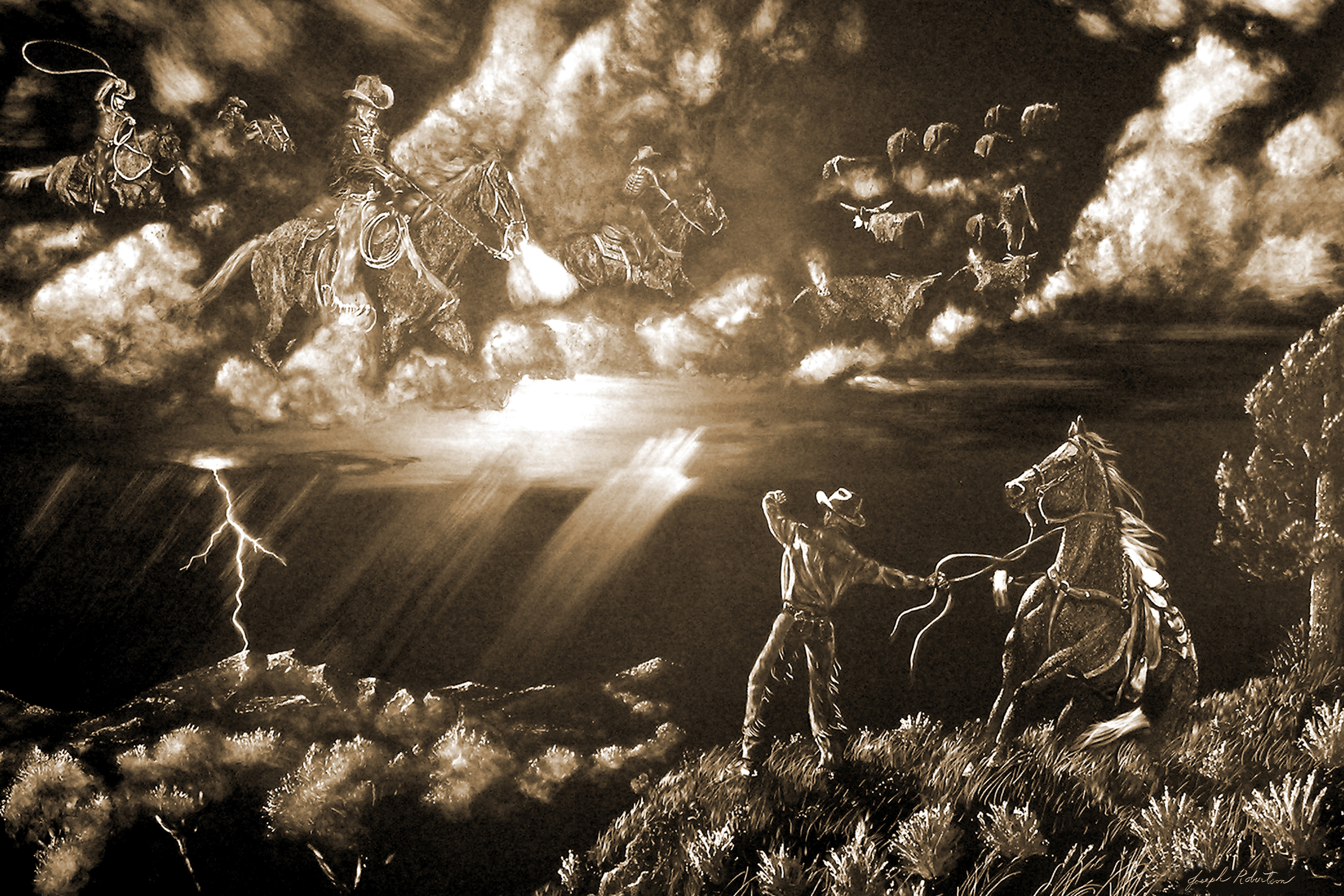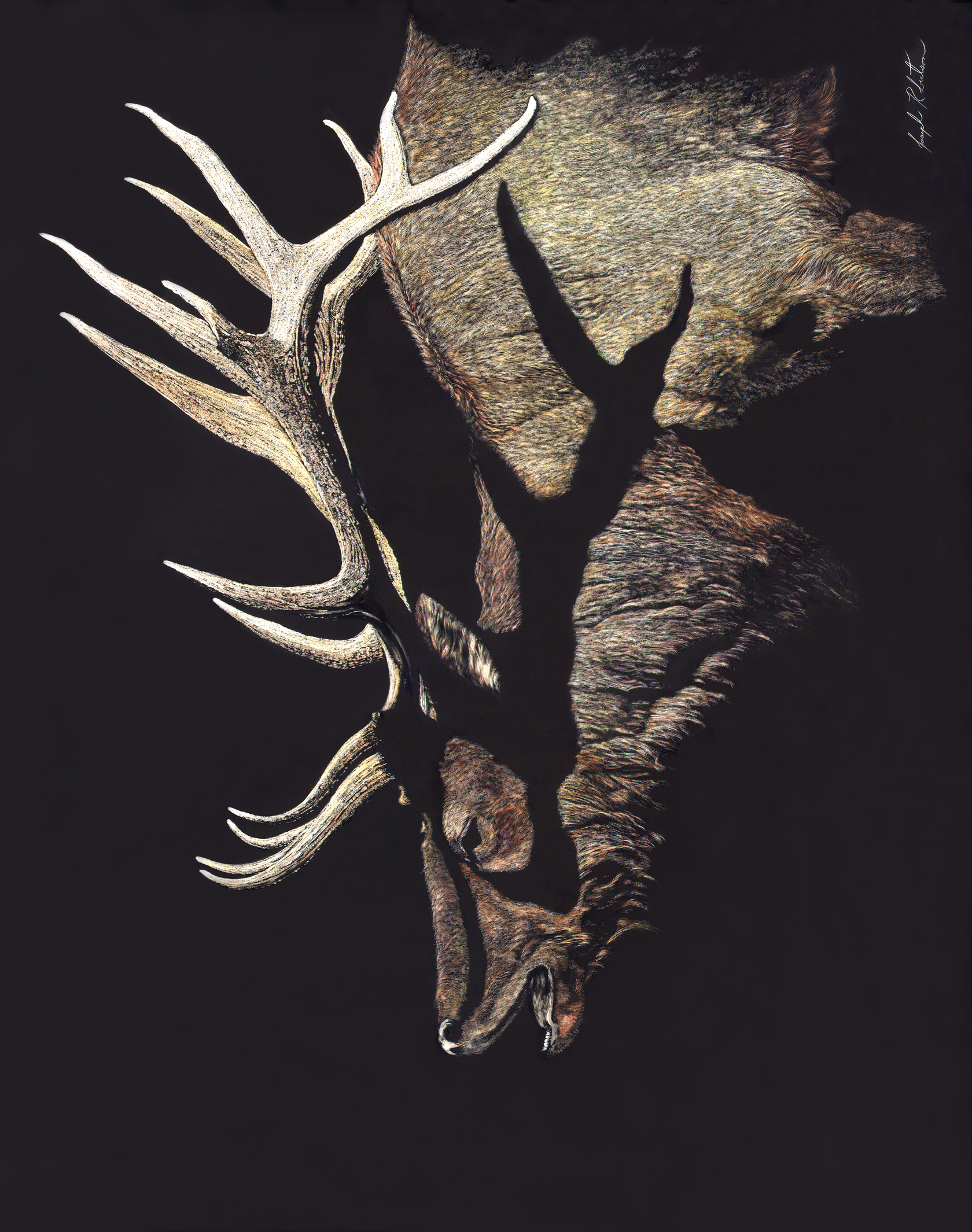 Joseph has spent his life in the arts. First as a musician and composer, now as a Western and Wildlife artist. Self-taught, he works in scratchboard (a whiteboard covered in black ink). His images are scratched or etched into the board then hand colored with transparent washes of acrylic paint. Subjects are often captured by the artist’s camera first then used as reference material for later works of art.