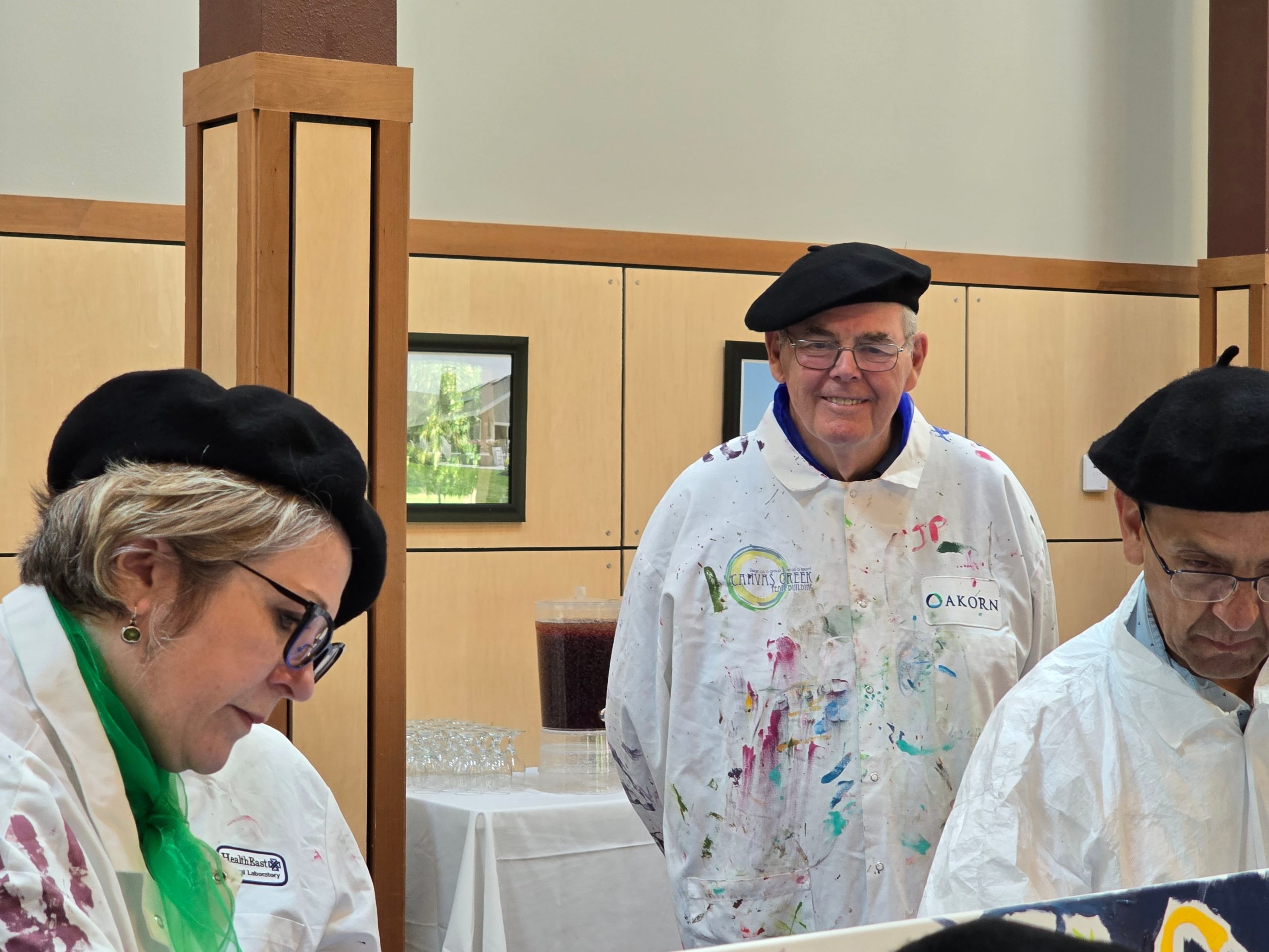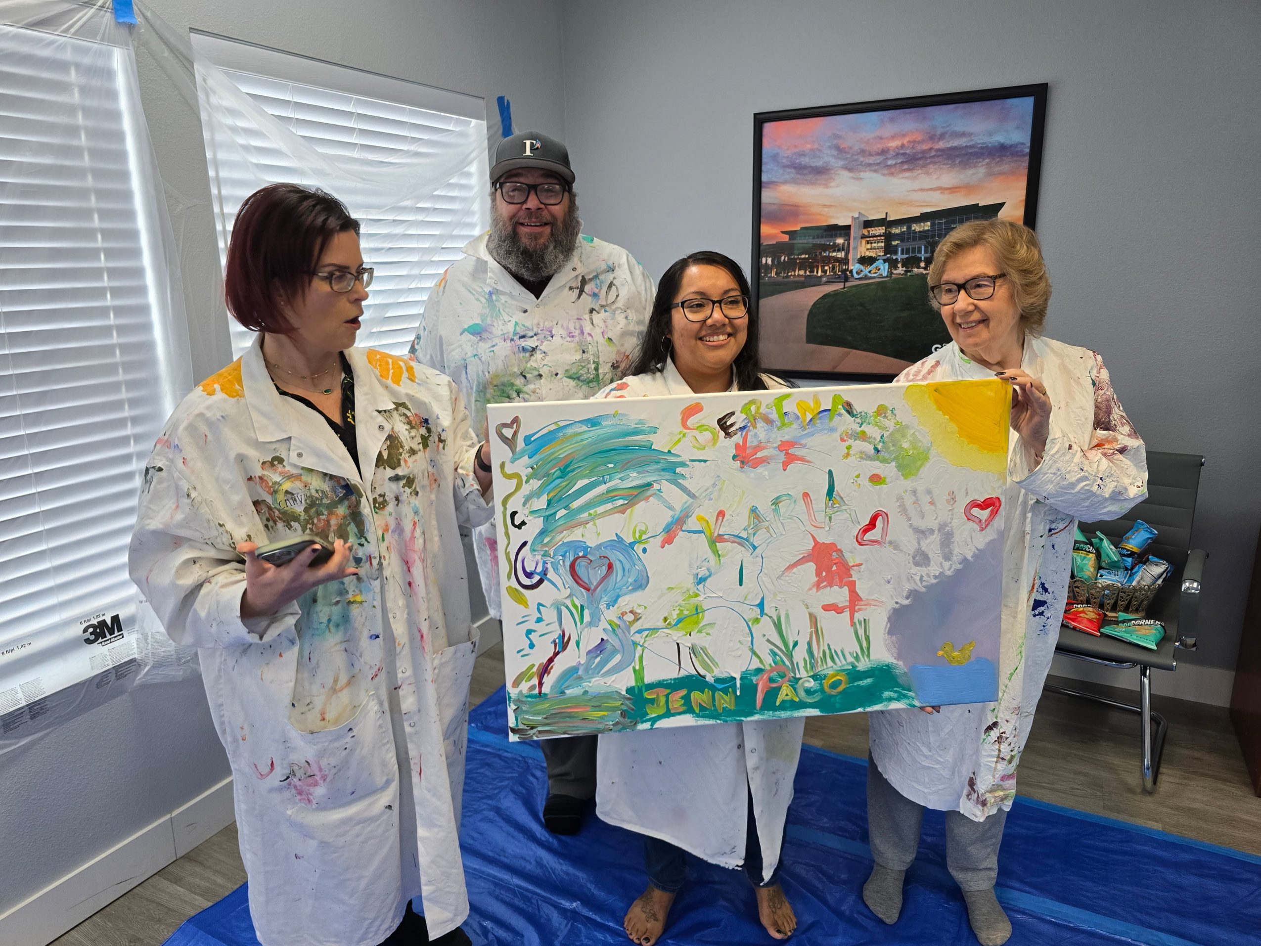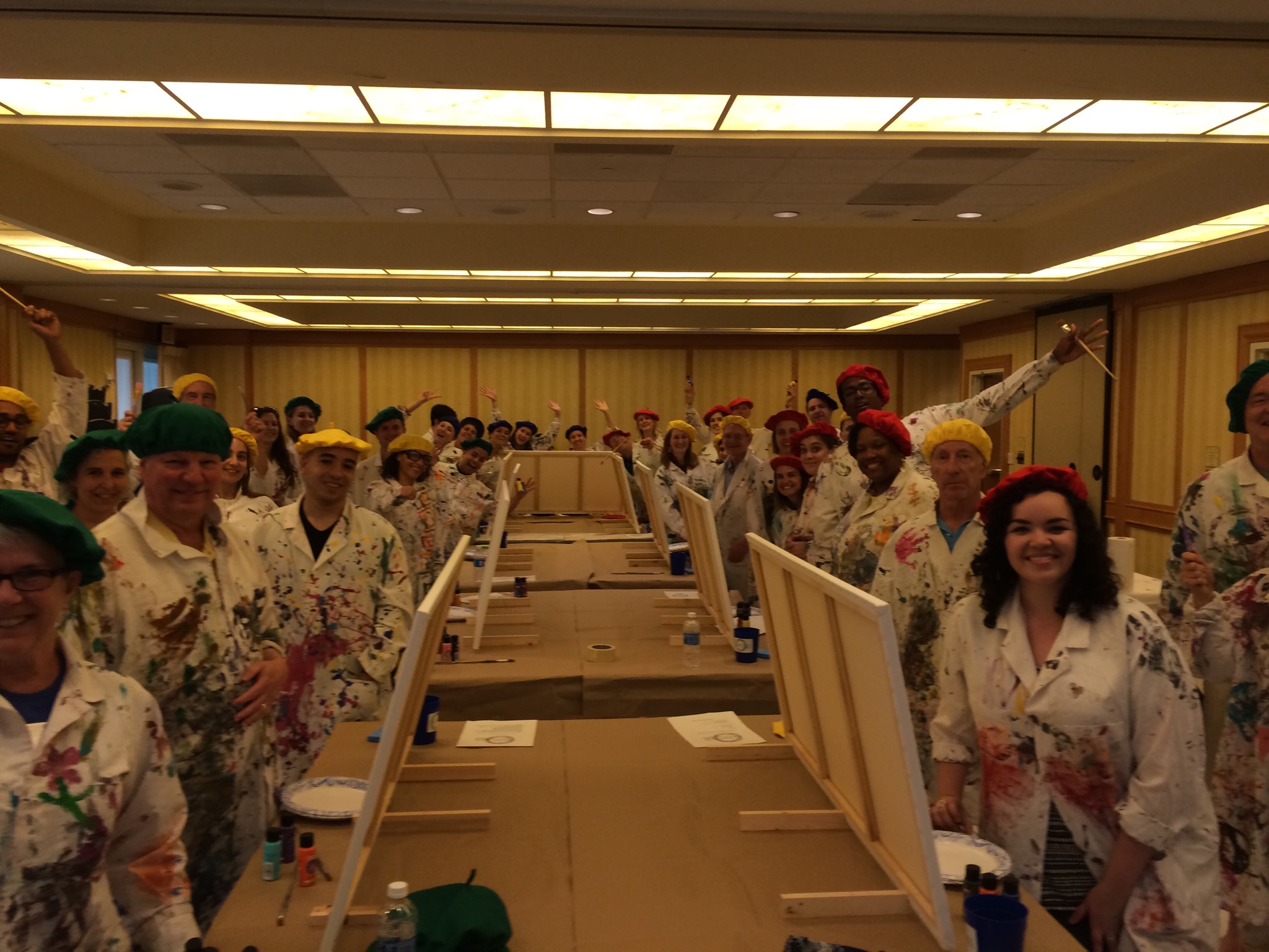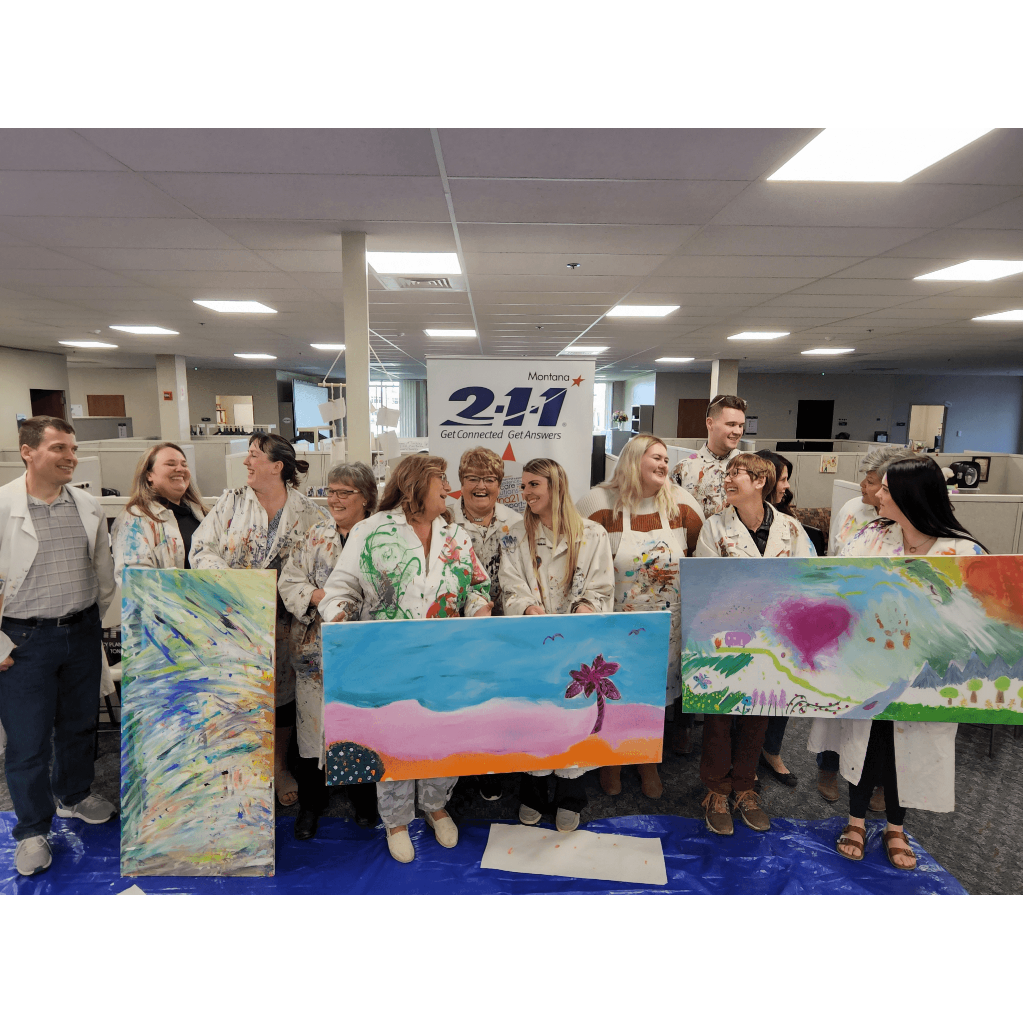 Imagine walking into the board room, or the cafeteria, and the floors are covered by a blue tarp, the walls have plastic on them, and there is a stream of tables on top of which sit large blank canvases. Unnerving? Exciting? Are you rolling your eyes, or clapping your hands? That feeling is stage one of our process, Begin. Some people aren’t happy about what they see, others are, and all are sure that not only can’t they accomplish this task, neither can ‘the bozos’ on their team. So, they begin, with hesitation. They are given roles, but not guidance, the team decides what to paint, what they might be proud of displaying. Then, the magic of stage two happens, Become. During Become the team has this realization that what they make will be better if they actually collaborate.