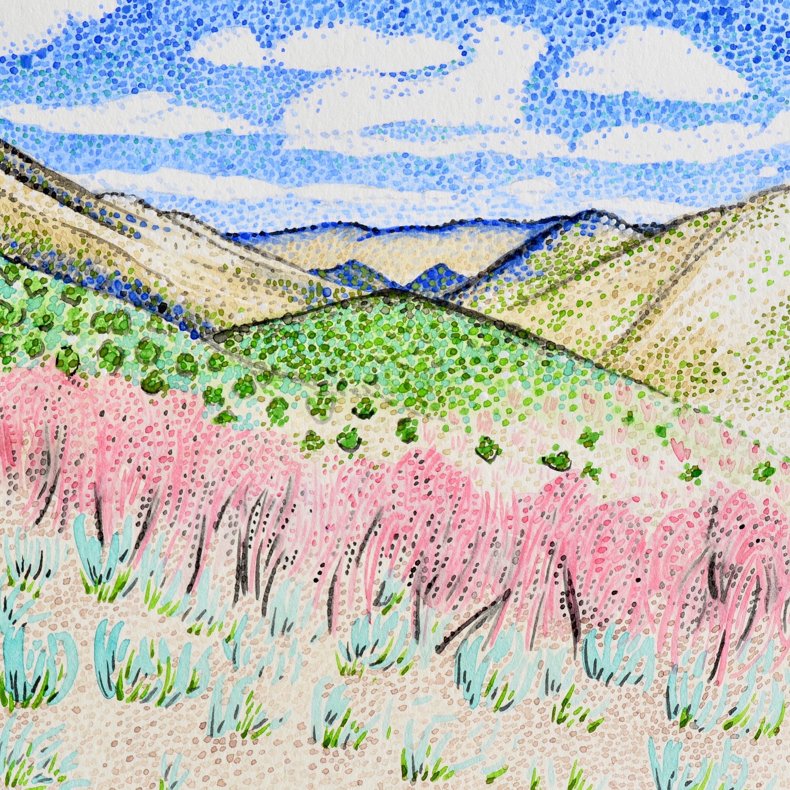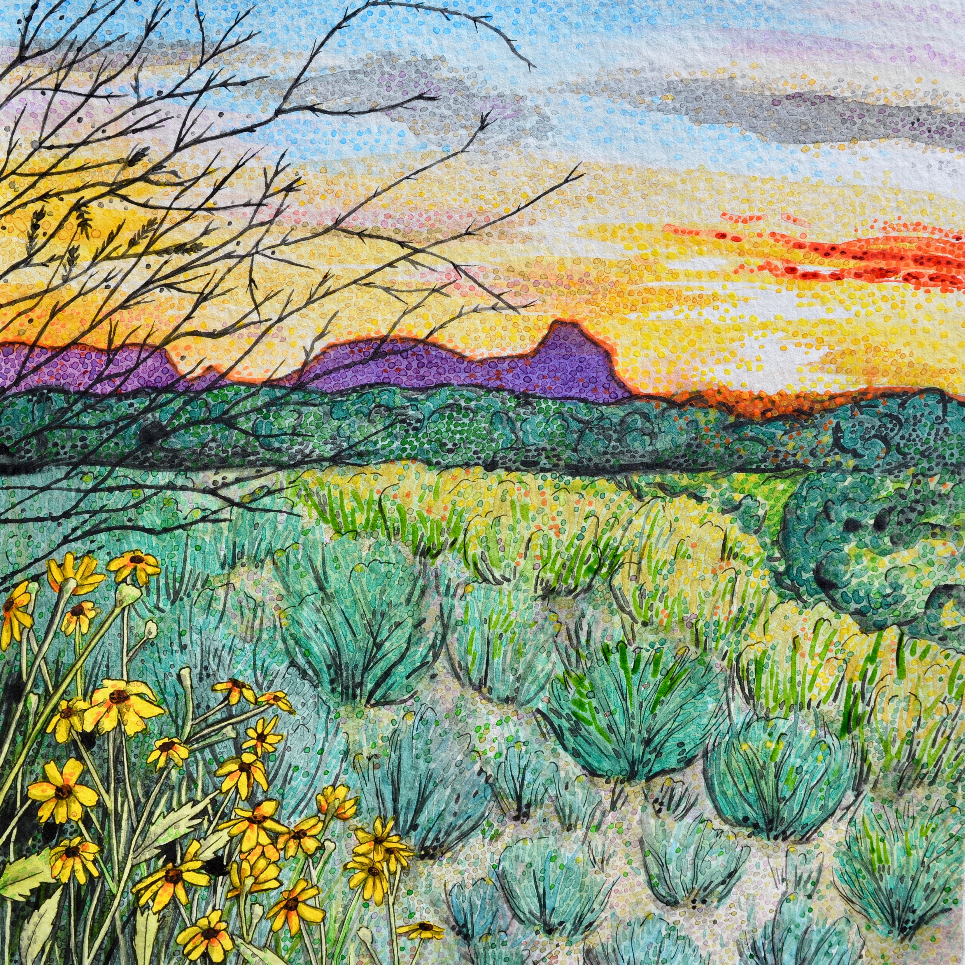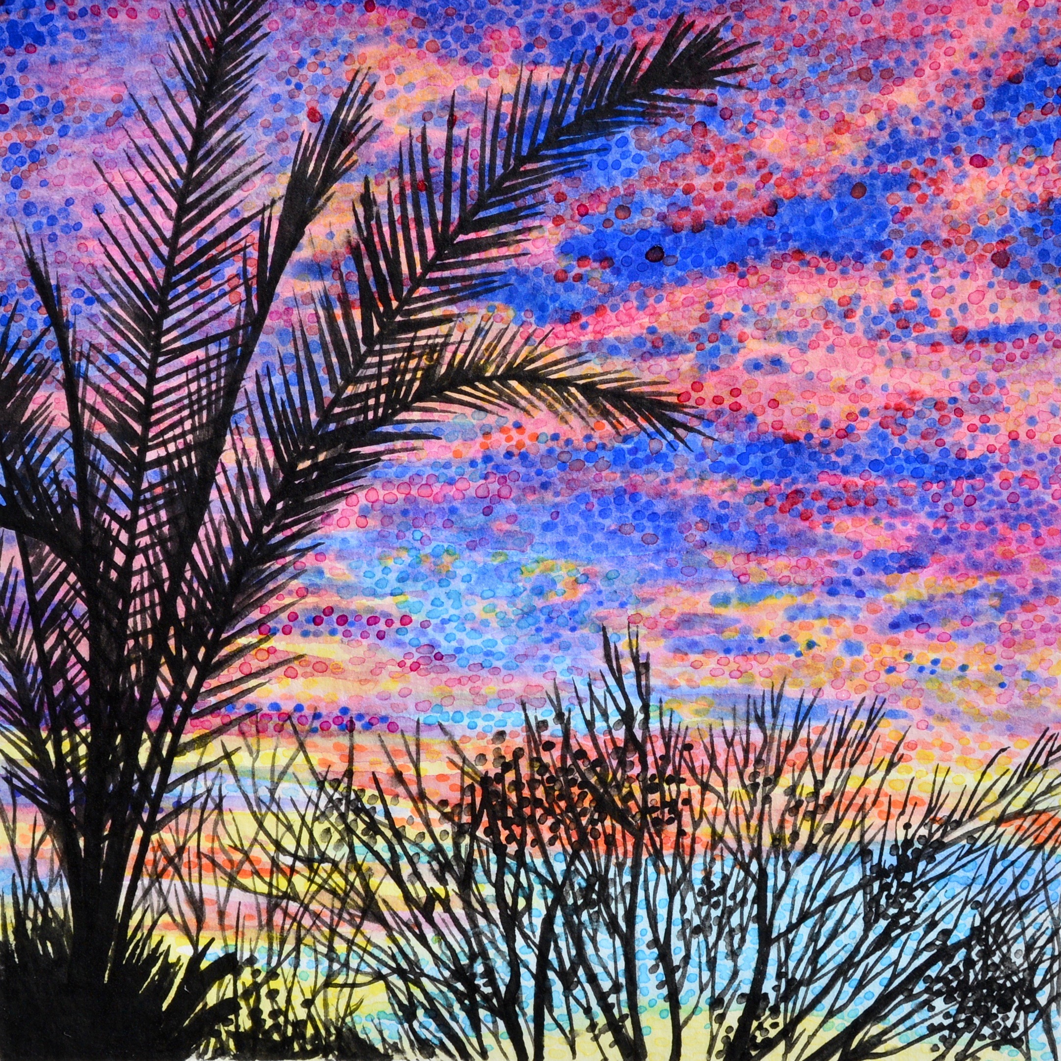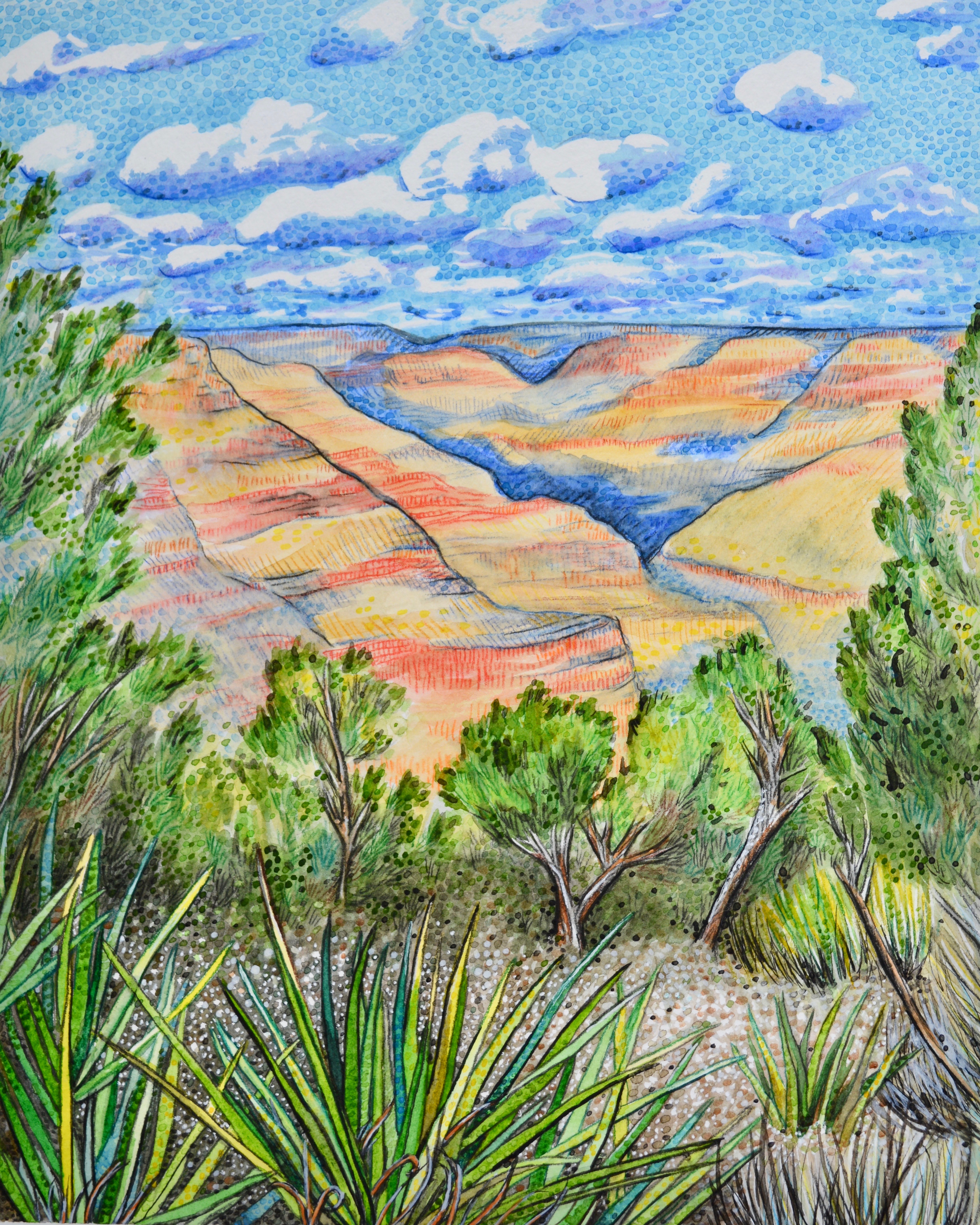 In many aspects of life, I feel driven to dare myself to do what feels uncomfortable, to reexamine what I dislike or avoid. In 2016 and 2017, I challenged myself to a whole new life, leaving everything I knew and traveling full-time across the United States and in the Caribbean. During this time, I also charged myself with exploring a different medium and subject matter. My previous work was based on portraiture of people and objects, gravitating toward a focus on an item and its details. Landscapes and their seemingly never-ending, complex components were overwhelming for me to process visually and conceptually. So, naturally, I became a landscape artist.
