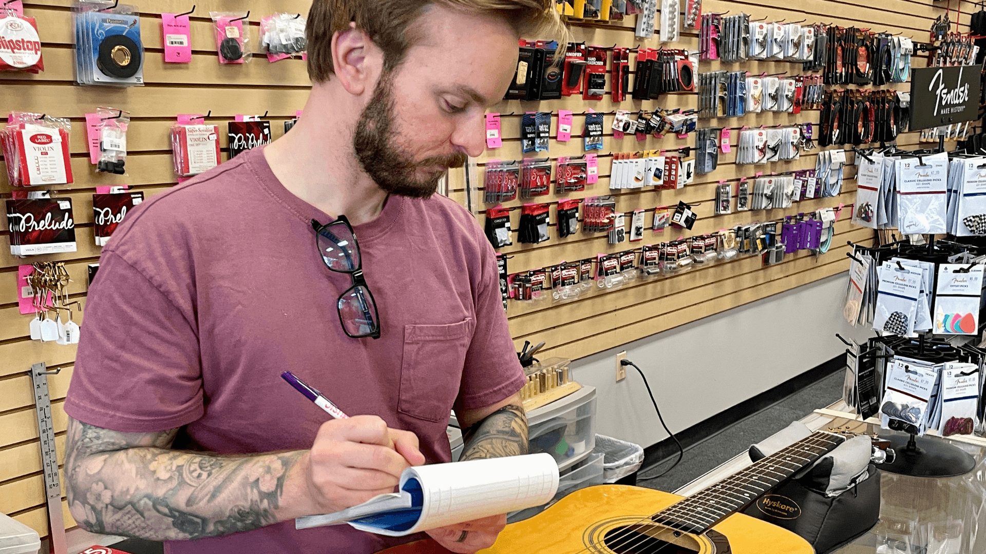 We open the store at noon and make sure everything is set up and ready for the day. From there, we spend much of our time helping customers as they come in—whether that’s assisting with purchases, rentals, lesson inquiries, or dropping off instruments for repair.